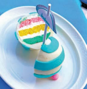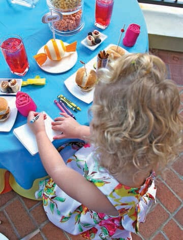 For dessert, the children were served candy-shaped mini personal cakes topped with each kid’s name, allowing the sweets to double as place cards. To make the cake place cards even more special and appealing to the children, the layers inside the fondant were rainbow colored. Crayons tied to tiny drawing notebooks and balloons painted with each child’s name were handed out as favors as parents picked up their children and their escort cards, making the day a memorable event.