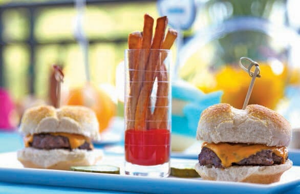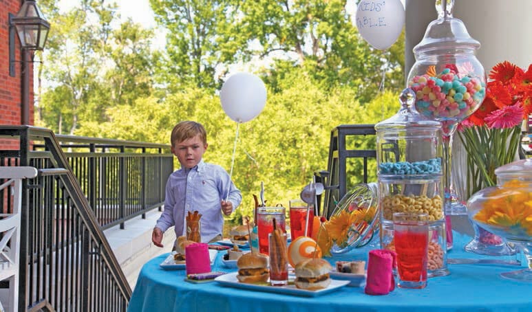 The eye-catching daisies add a pop of formality while still keeping with the whimsical theme. Out-of-the-box food ideas that appeal to kids of every age were served at this event, which was held at Prestonwood Country Club. Mini burgers and fries served in shot glasses, along with peanut butter and banana sushi rolls, converted all-American snacks into gourmet delights.